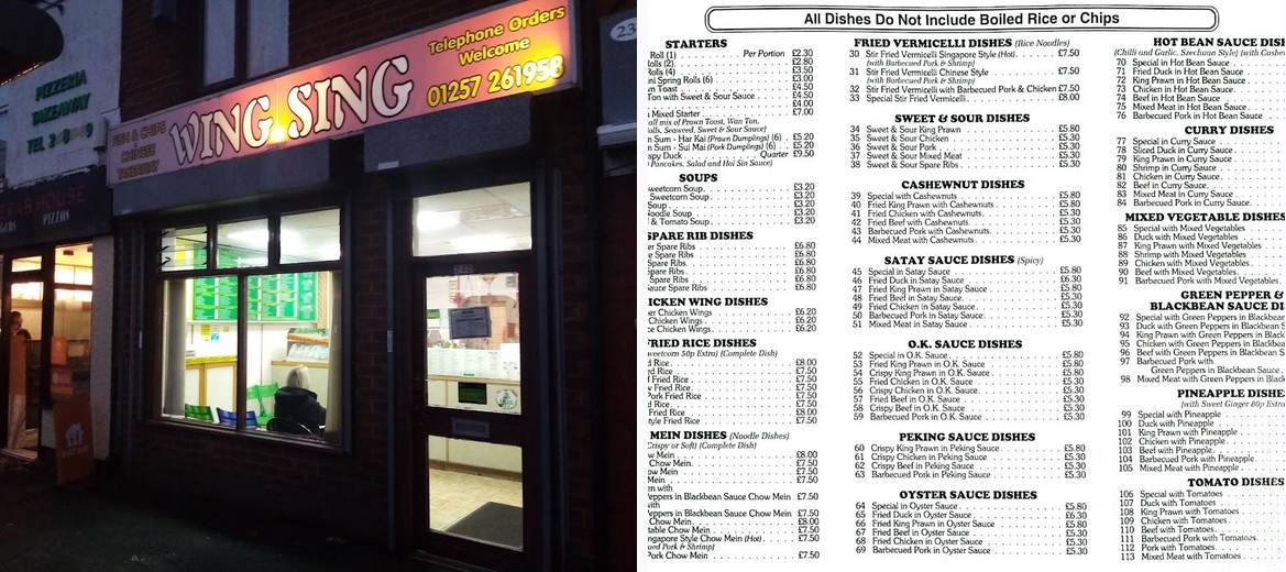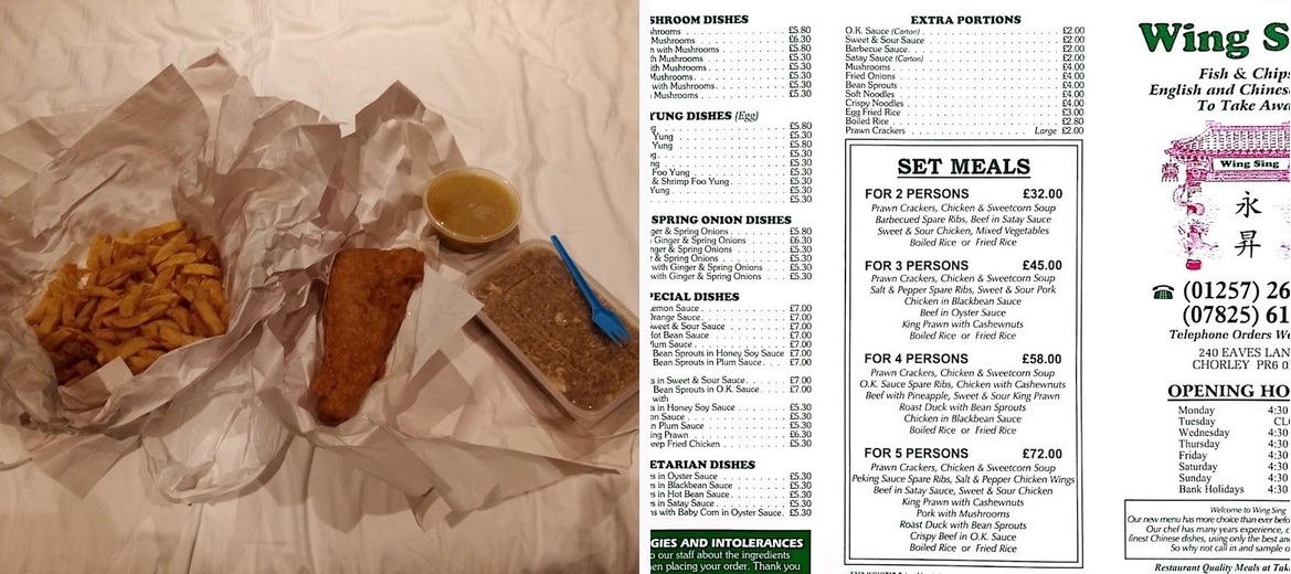 Wing Sing Fish & Chips is a delightful Chinese takeaway located at 240 Eaves Lane, Chorley. This gem offers a unique twist on traditional takeout with a menu that skillfully marries classic fish and chips with authentic Chinese cuisine. Expect friendly service from Tina and her family, who put heart into every dish. The welcoming atmosphere makes it a great spot for a quick dinner or a late-night snack. You’ll find affordable prices, ranging from £10 to £20, making it accessible for everyone. Whether you're grabbing a meal to enjoy at home or dining in, Wing Sing promises a satisfying experience enhanced by hearty portions and robust flavors.